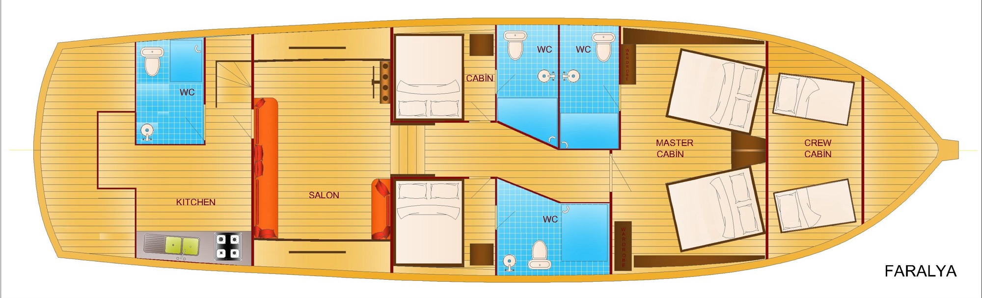 Gulet FARALYA is a 20-metre traditional yacht available for private rental in Turkey. With 3 cabins for up to 8 guests, she is an ideal choice for small families or groups of friends who want a simple, elegant, and authentic gulet holiday. Each cabin has private facilities, and the yacht is kept in excellent order by her dedicated owner and crew.