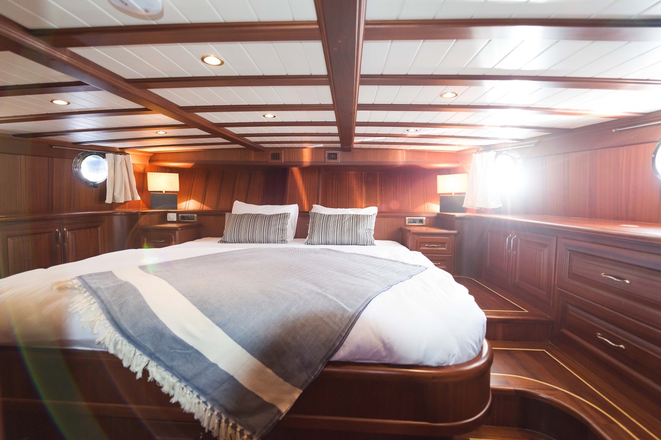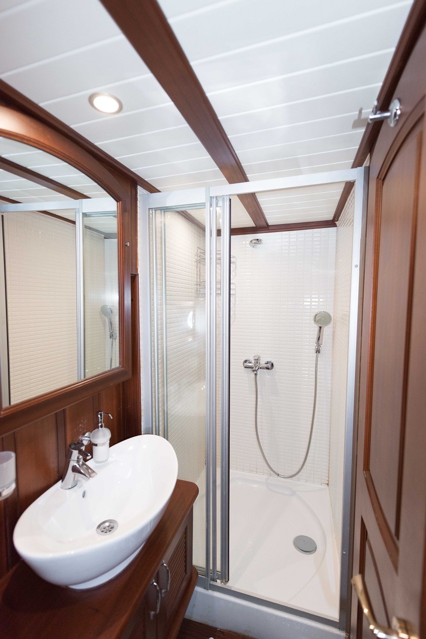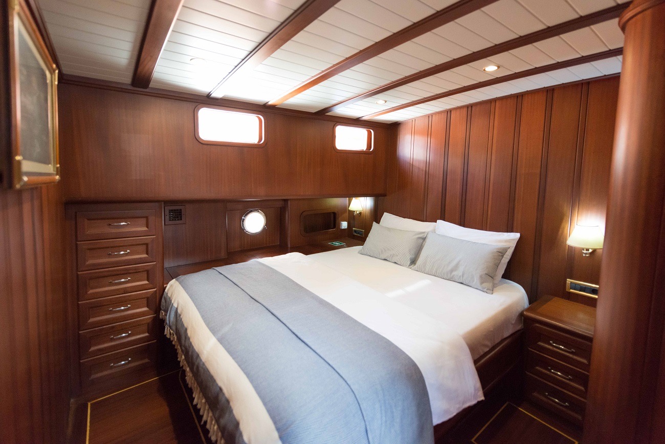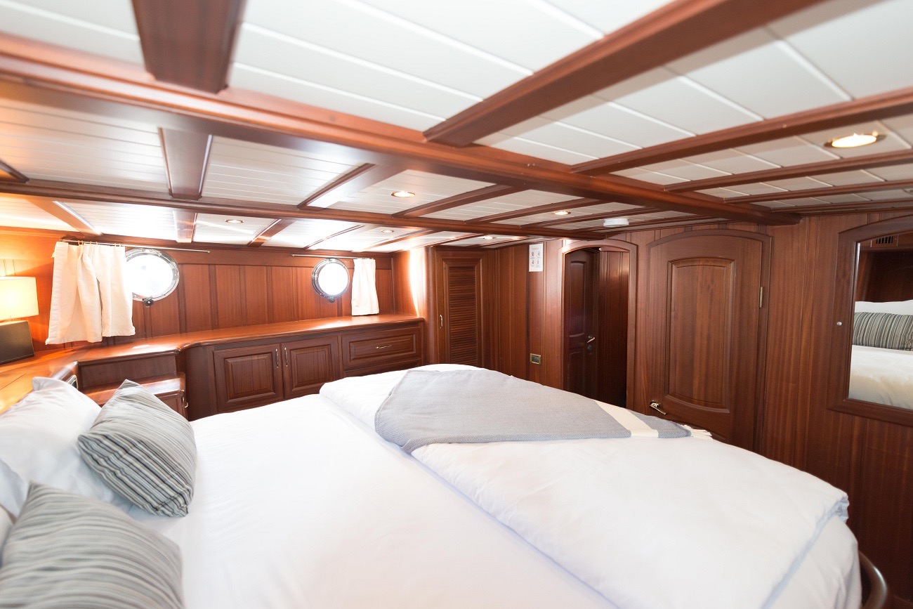 PRIMADONNA’s interior features a master suite and two double cabins, each fitted with ensuite bathrooms and air conditioning. Her wooden finish creates a cozy, traditional atmosphere, while the crew of 3 members ensures that service is attentive yet discreet. They handle all details of daily life on board—from preparing meals to navigating between destinations—so that you can fully relax and enjoy your time at sea.