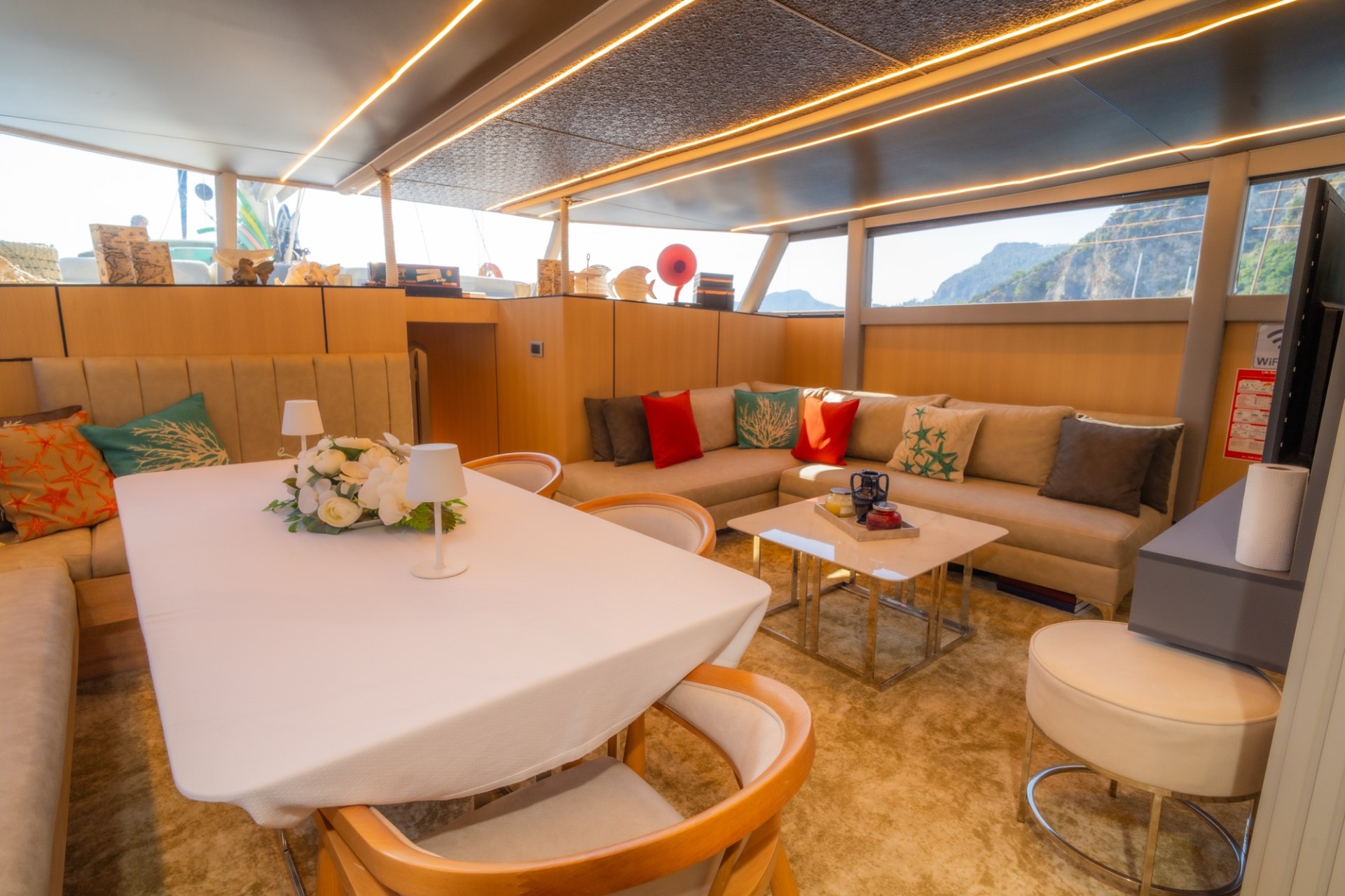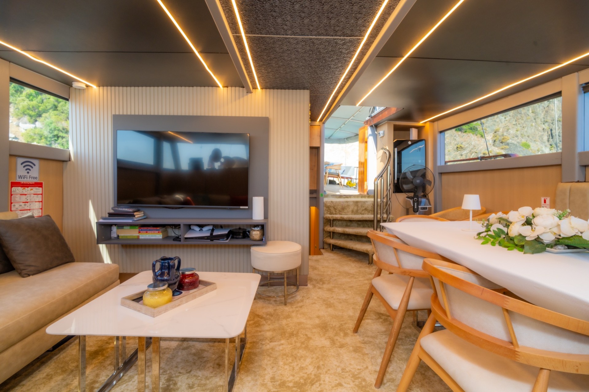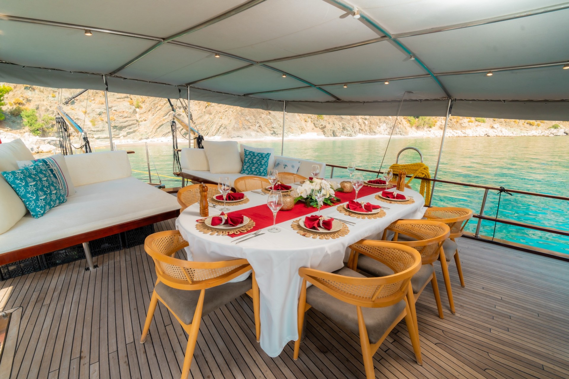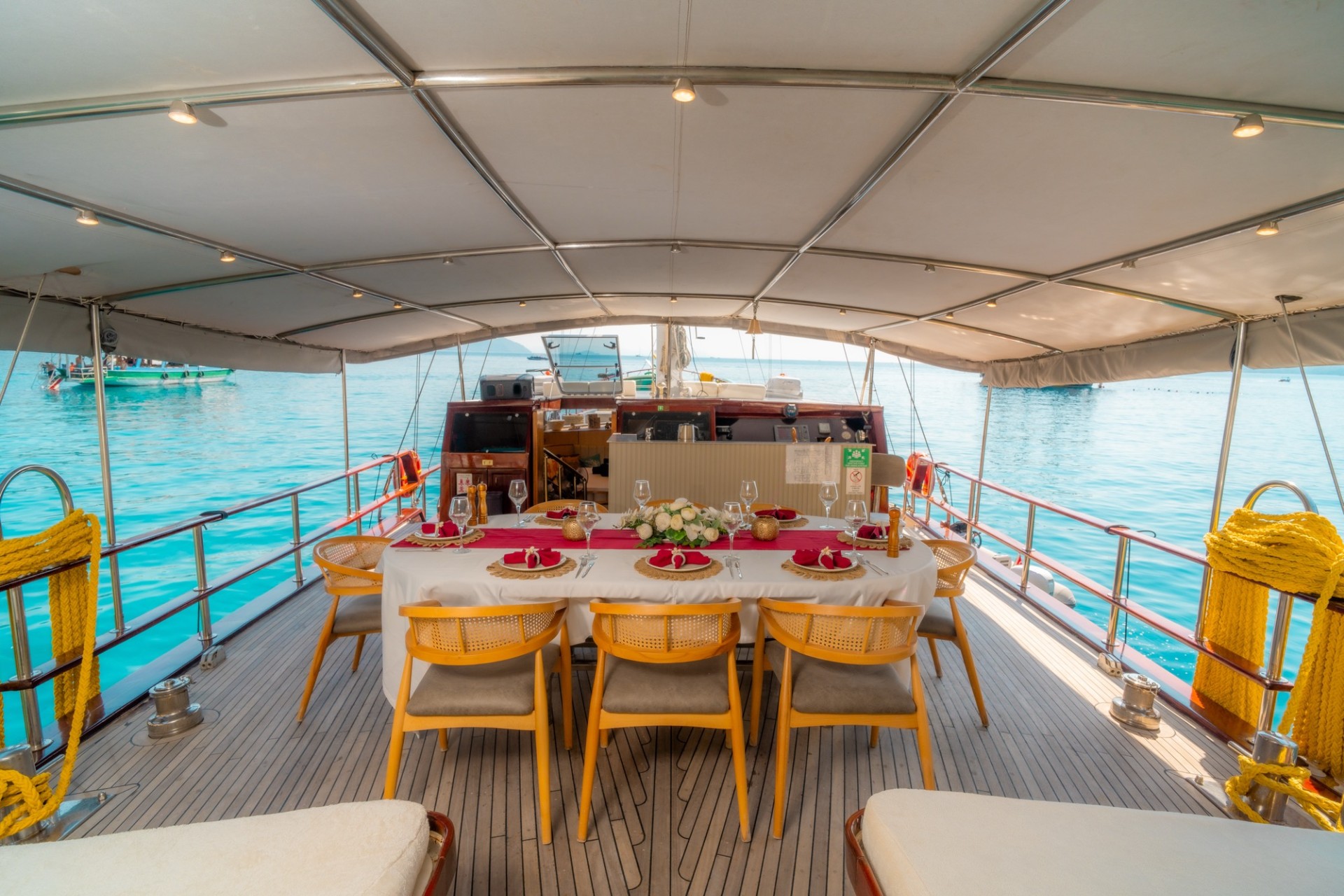 Charter rate includes, yacht insurance, fuel for average cruising time a day, daily cabin and bathroom cleaning, crew services, mooring fees in Türkiye, rent of the yacht, service boat, canoes, paddle boards, etc., ship's laundry (if available)