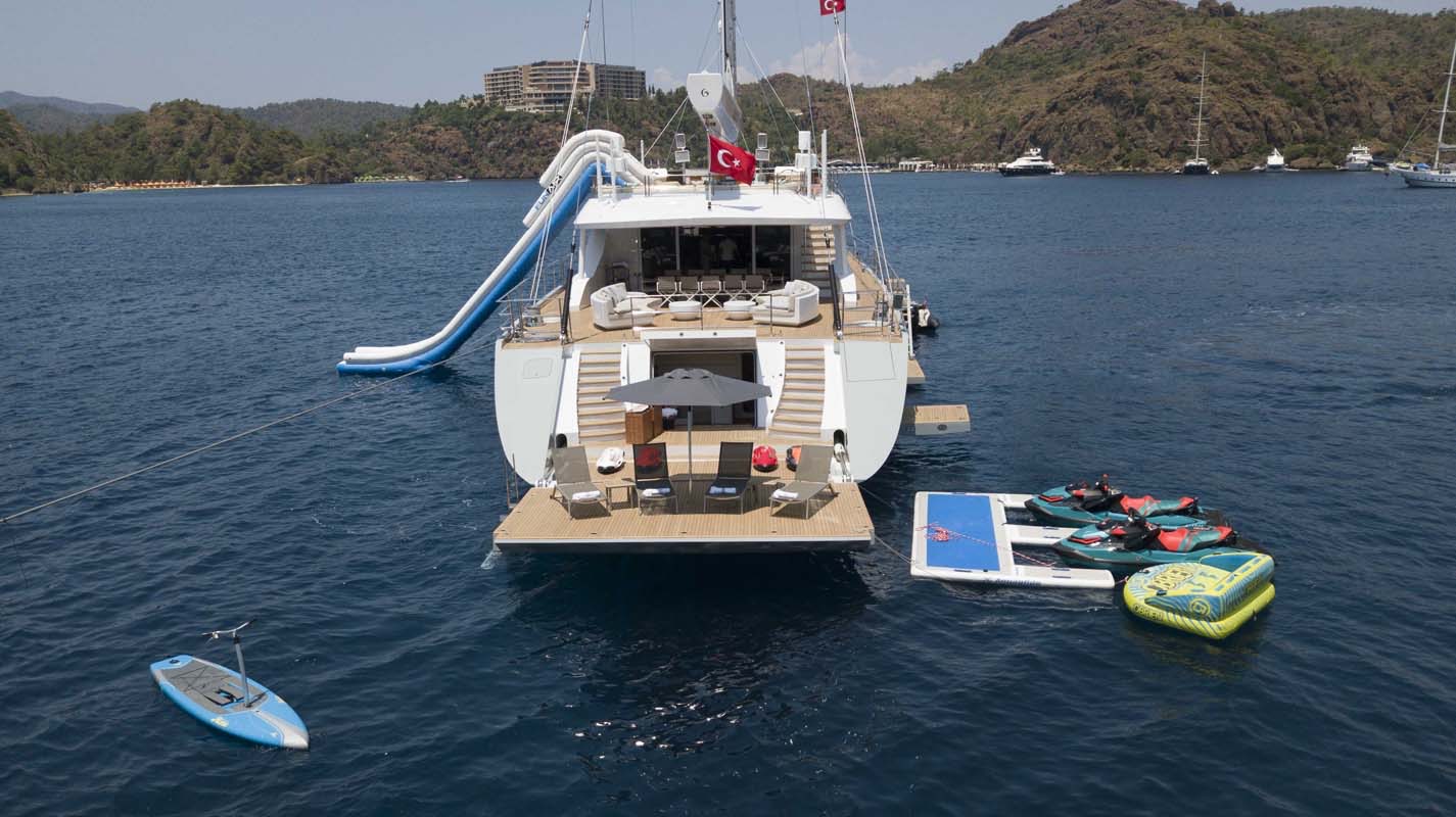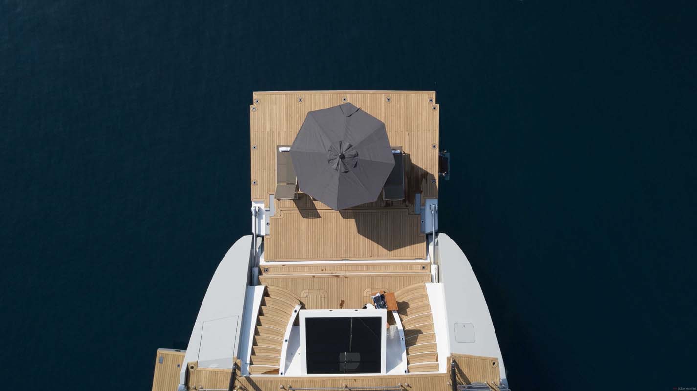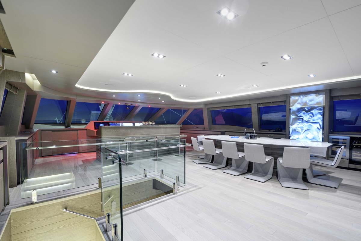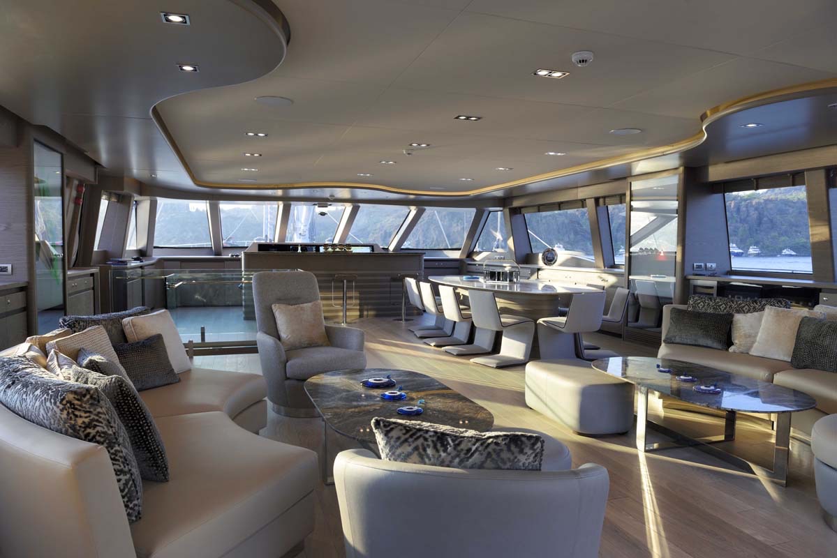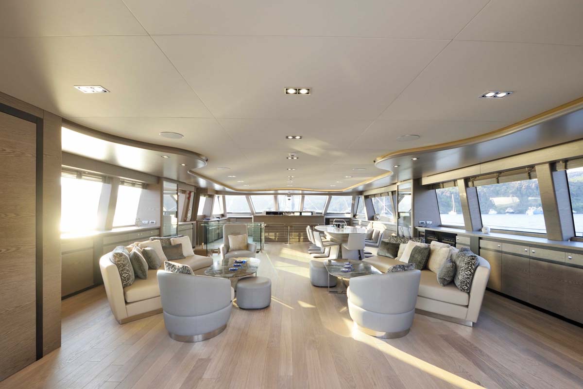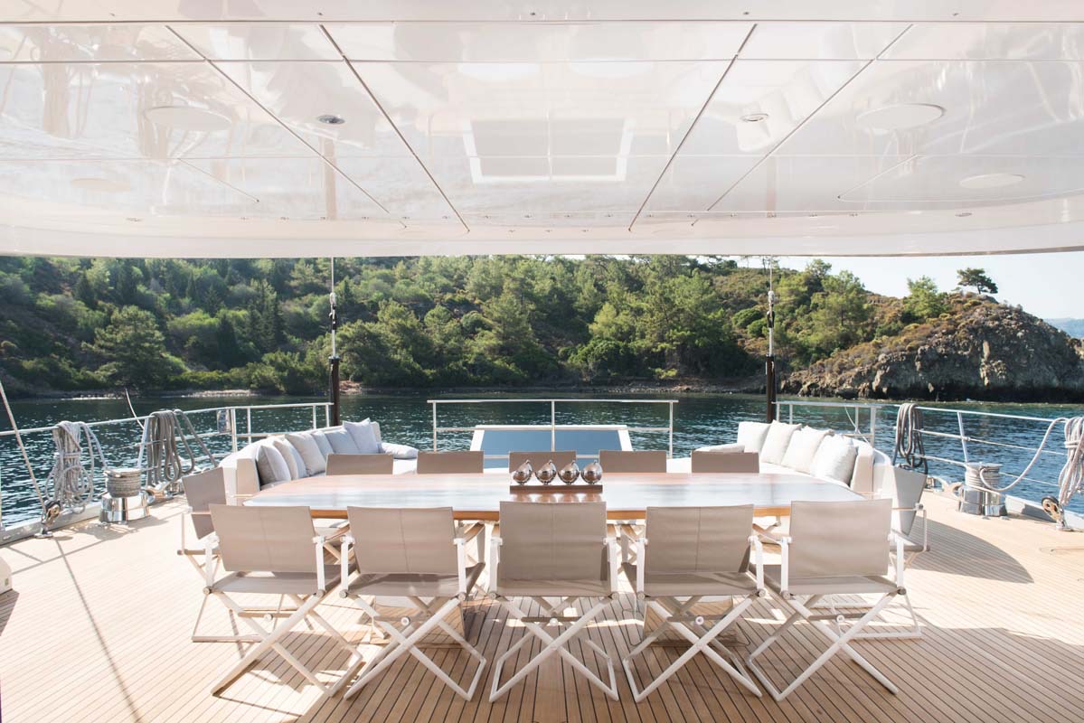The yacht's designers have been praised for their choice of a simple design which really works well for a charter yacht of this size. ALL ABOUT U's open, uncluttered spaces make her an entertainer's dream-come-true, and with that host of watersports toys and guest tenders she offers out of her garage and off her swimming platform, life aboard is one long movie.