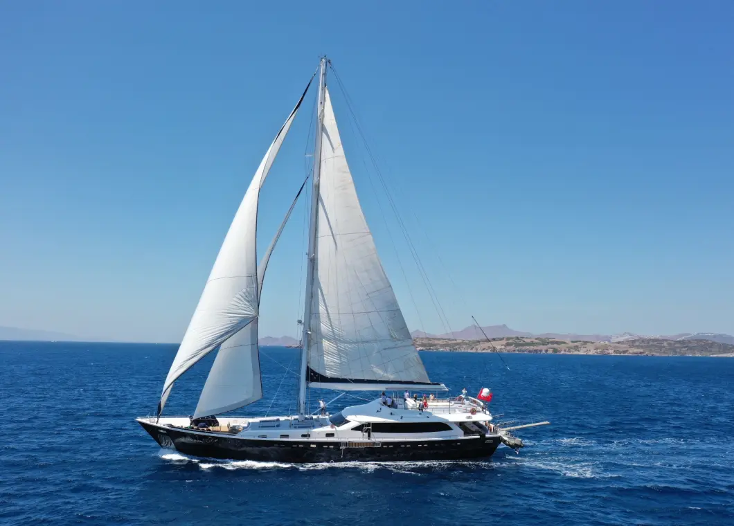 The gulet, CANARIA (ex. Gulmaria) is a luxurious motor-sailing yacht, purpose-built for crewed charter in the warm Eastern Mediterranean waters. She is at once chic and super comfortable. Her blue hull holds two full width master cabins and four roomy VIP guest cabins, accomodating a party of top to 12 guests.