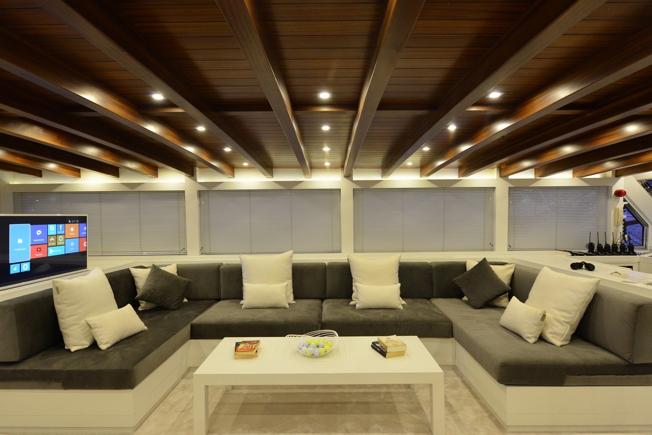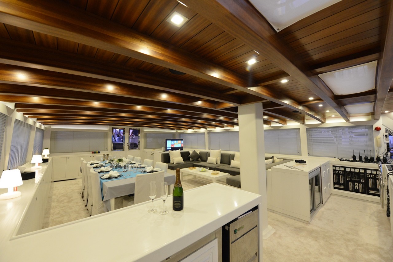 Guests can choose to lounge in the air conditioned comfort of the yacht's spacious deck saloon, complete with lushly cushioned sofas and well-equipped entertainment system. Alternatively, they can opt to find a quiet spot to relax and stretch out on deck, under the cover of the aft awning or forward, on one of nine sun mattresses.
