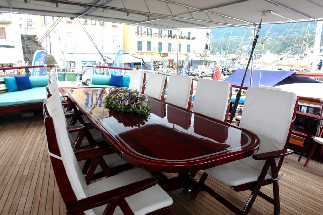 The yacht features a very nice outdoors solution for the relaxation and socializing. There is a foredeck with a cushioned area and sun beds. There’s also an aft deck with a big dining table where most meals are taken. Inside the saloon there’s TV with DVD, music system and much more for the entertainment.