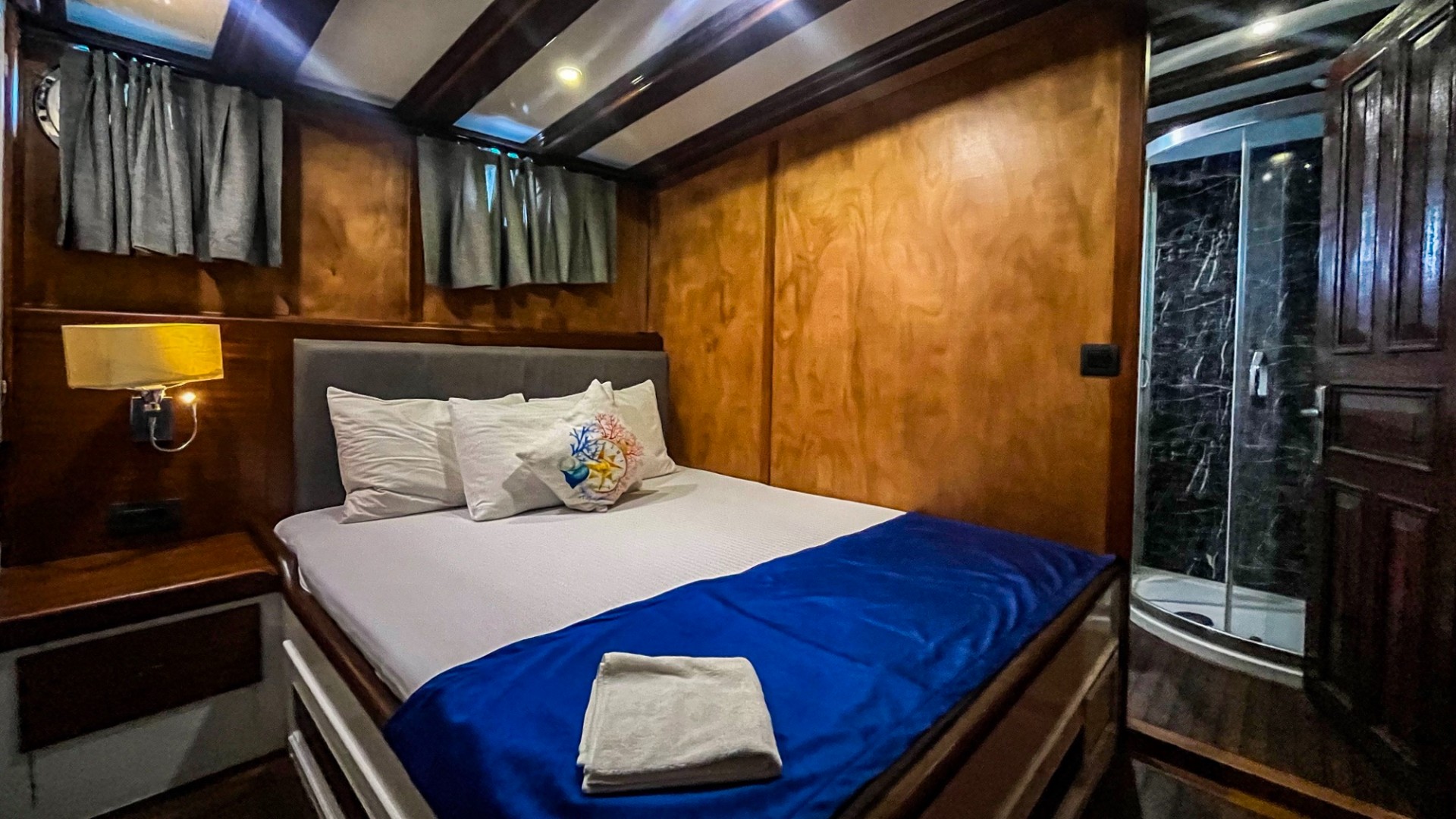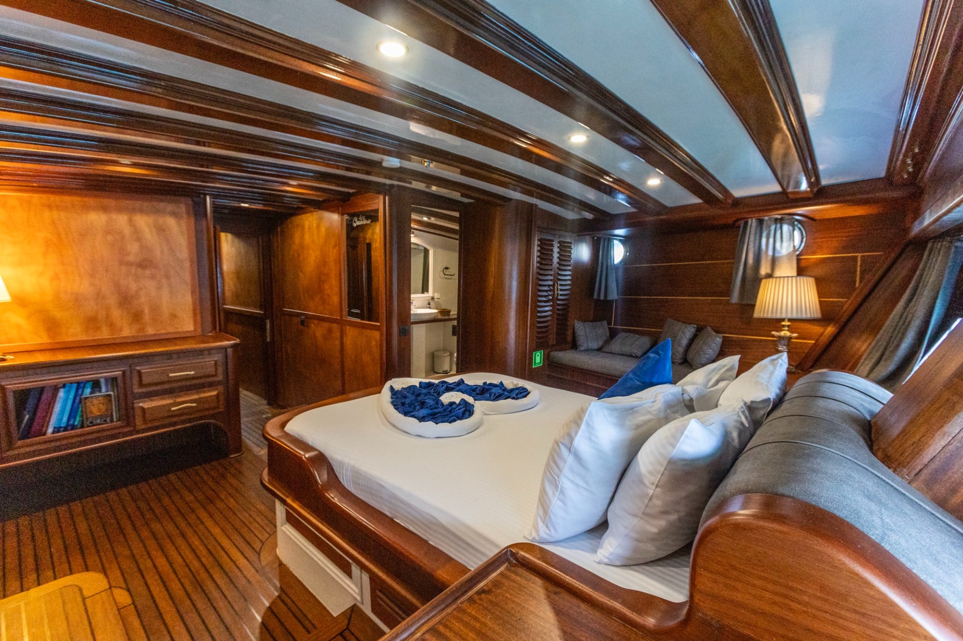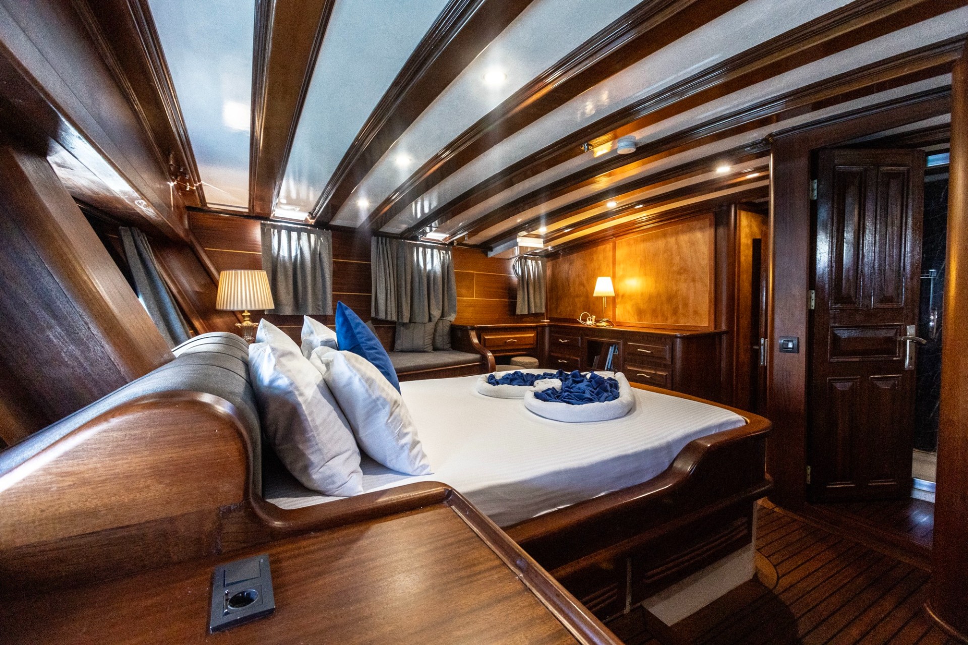 She features 6 cabins: 1 Master, 1 VIP, 3 Double, and 1 Tripe staterooms. Each cabin has its own bathroom facilities, AC system, and plenty of storage space. You will enjoy her interior designed in light colors. The wood work and the interior features give a feeling of a vintage cruising experience.