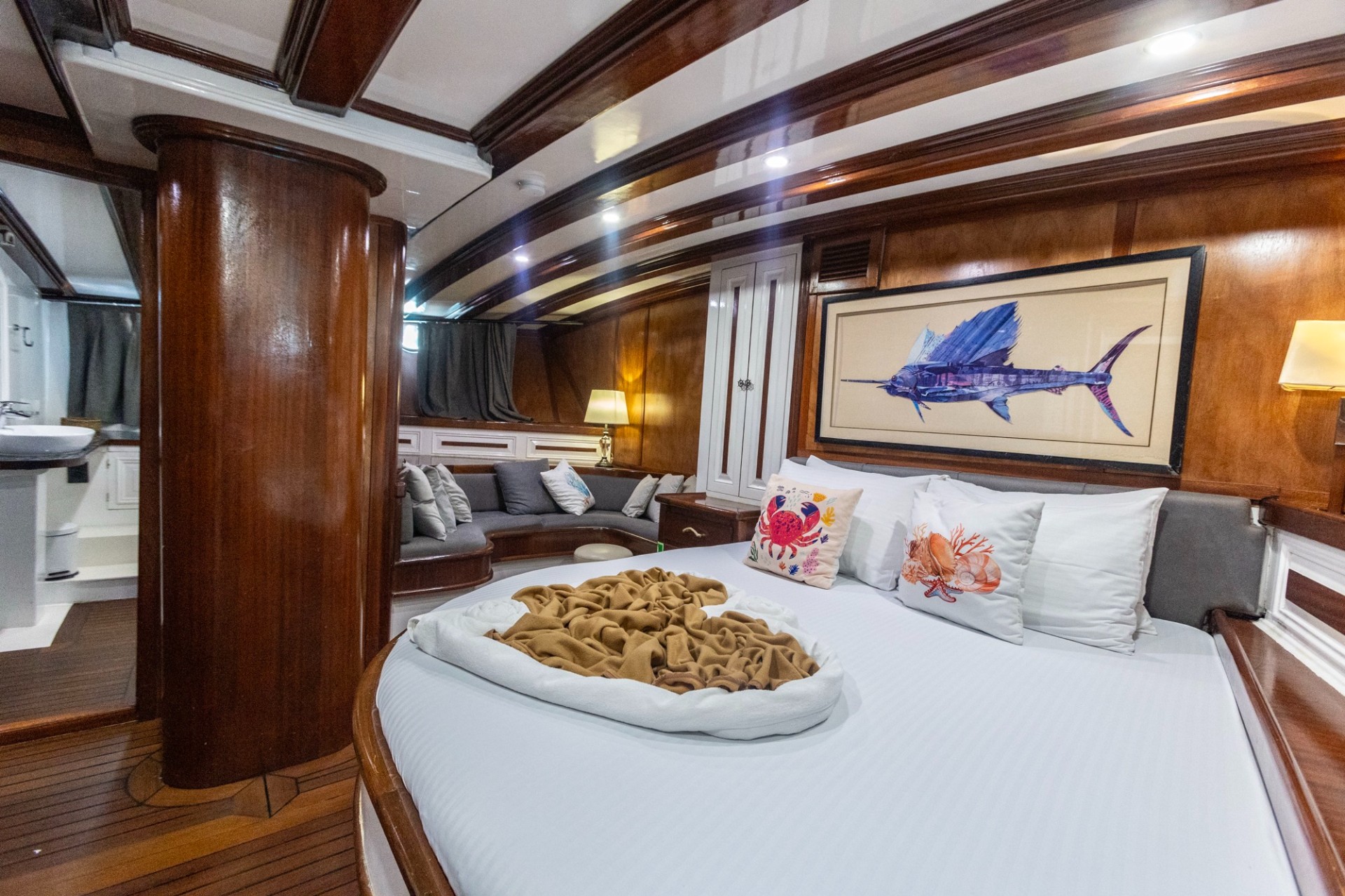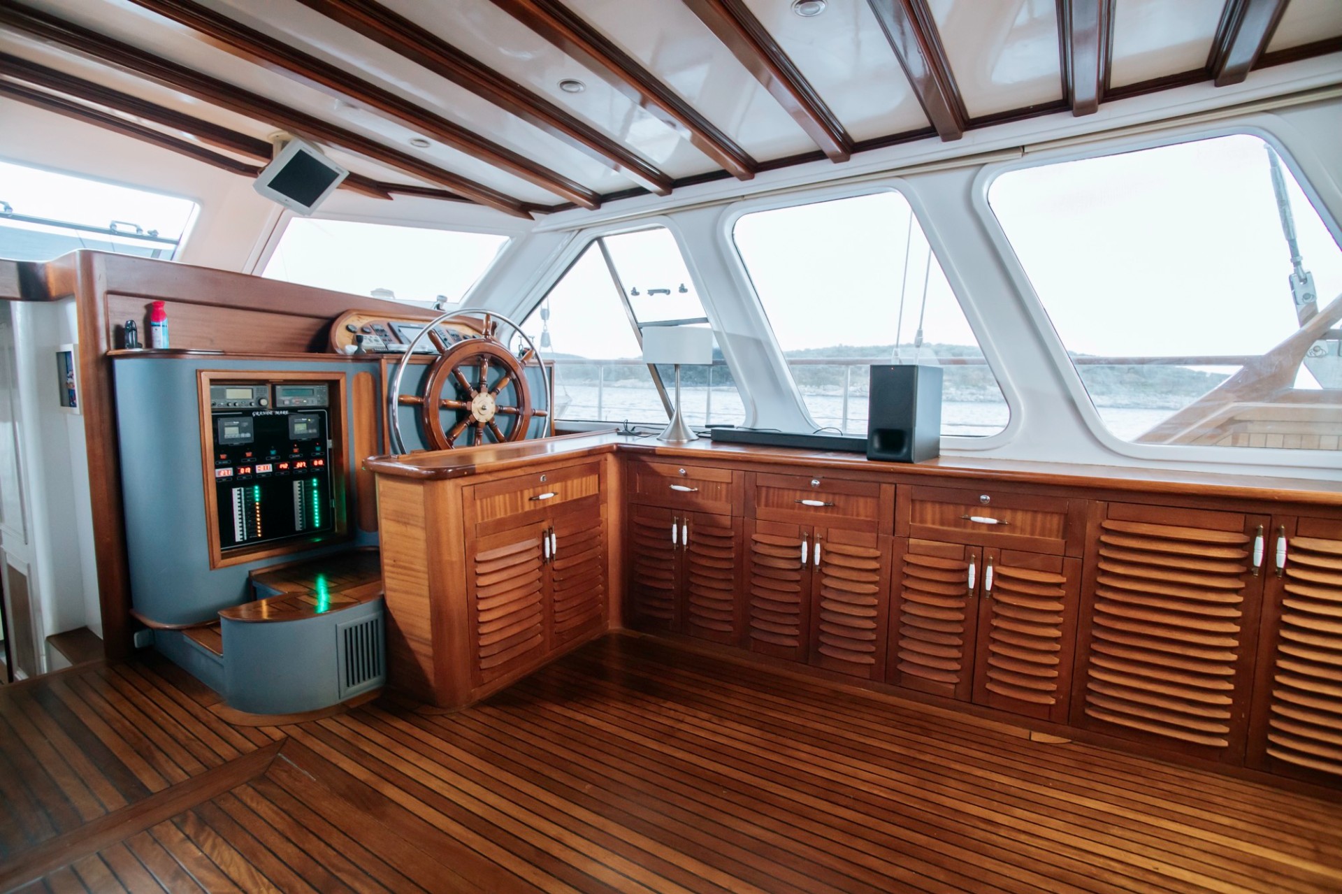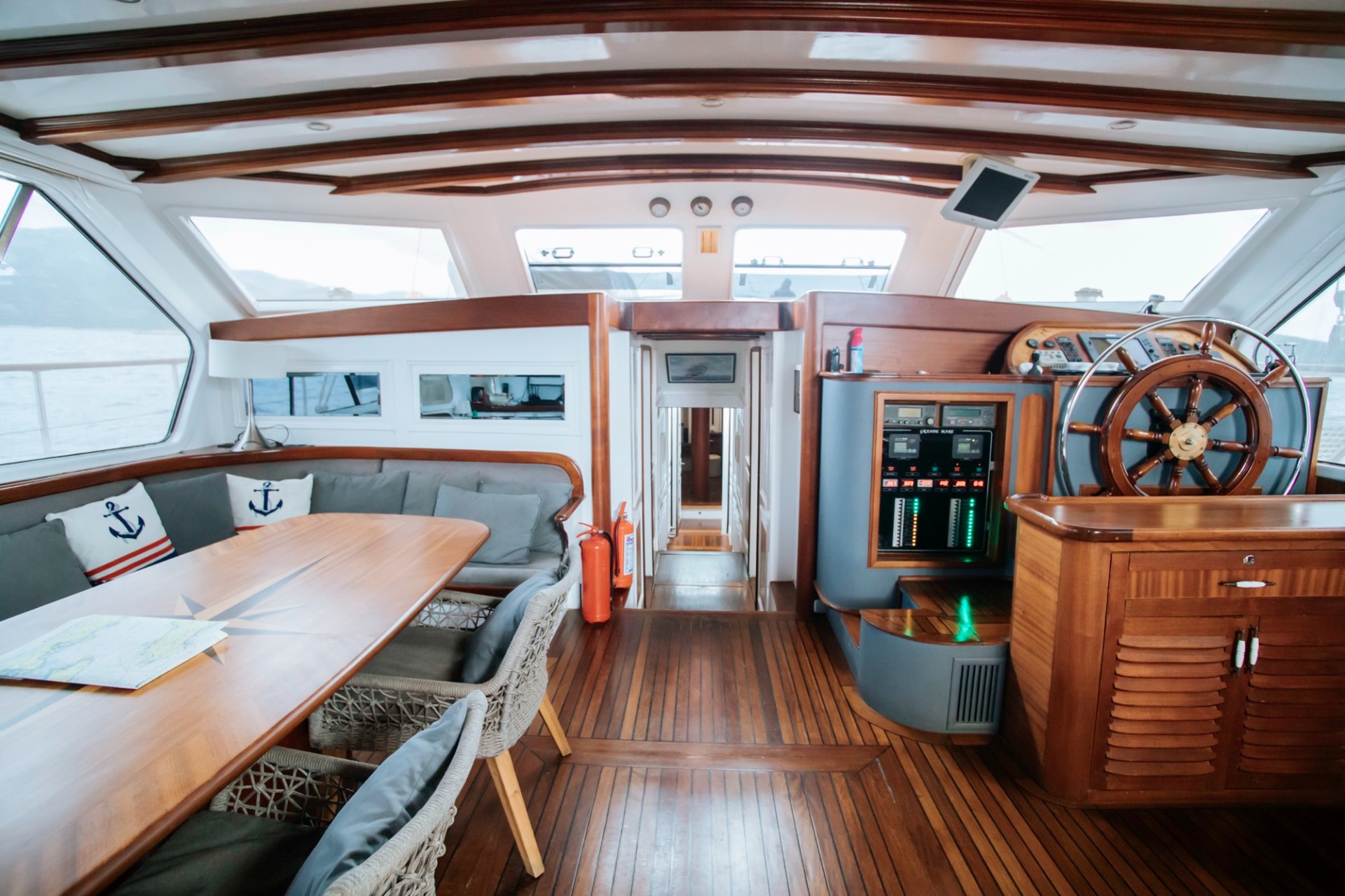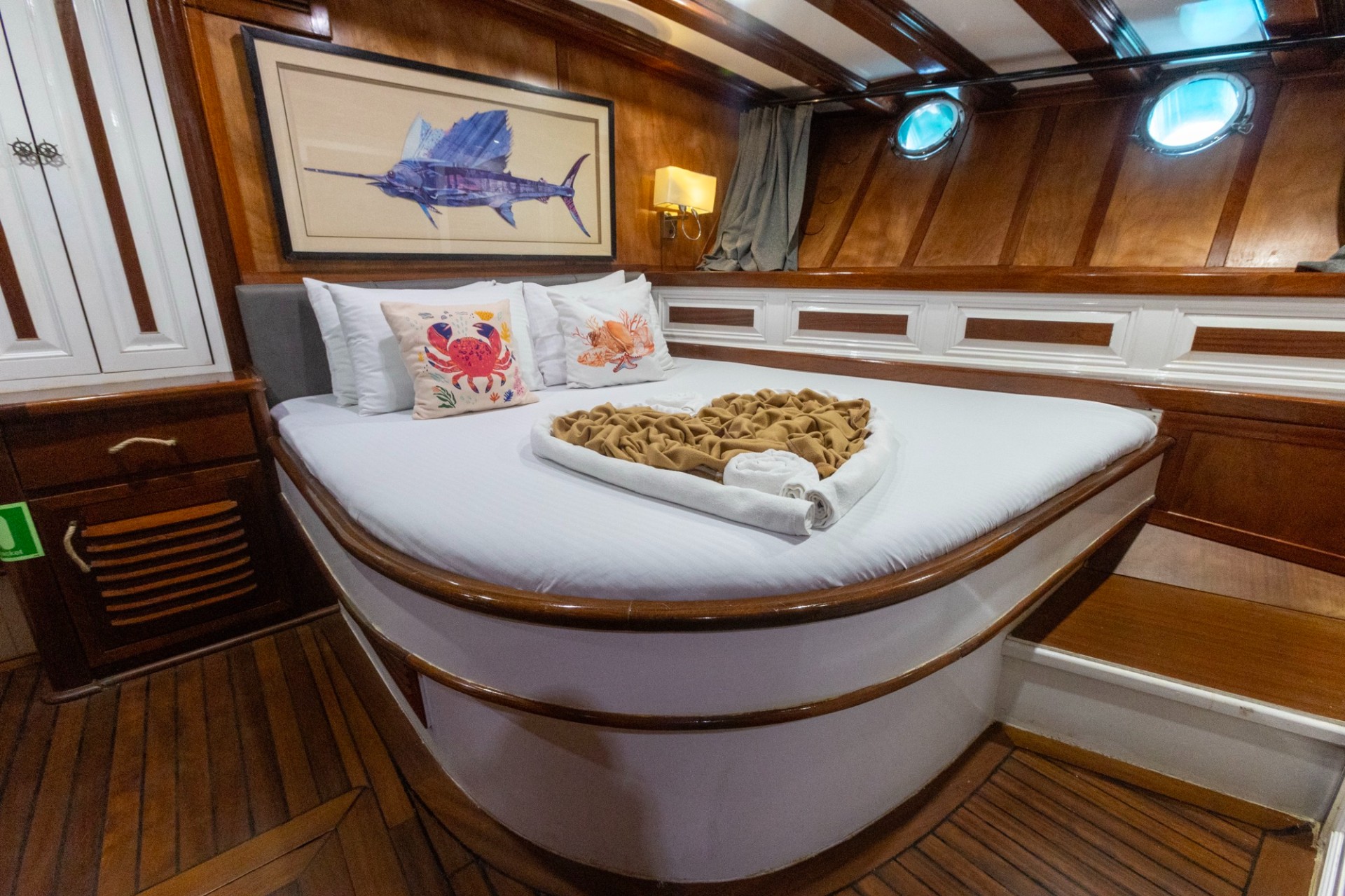 She features 6 cabins: 1 Master, 1 VIP, 3 Double, and 1 Tripe staterooms. Each cabin has its own bathroom facilities, AC system, and plenty of storage space. You will enjoy her interior designed in light colors. The wood work and the interior features give a feeling of a vintage cruising experience.