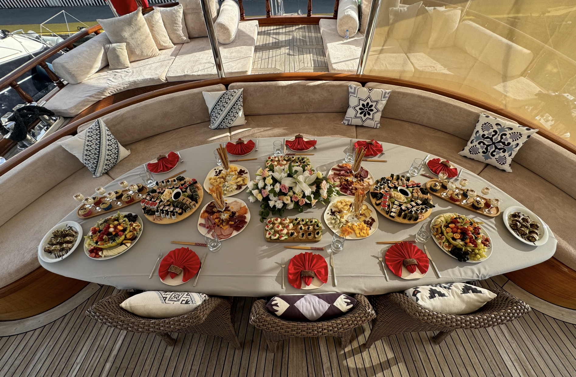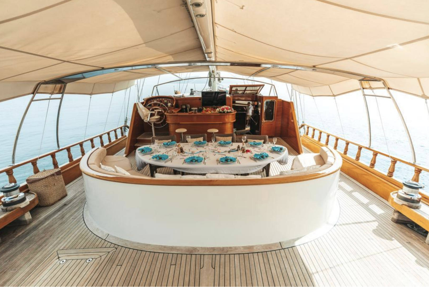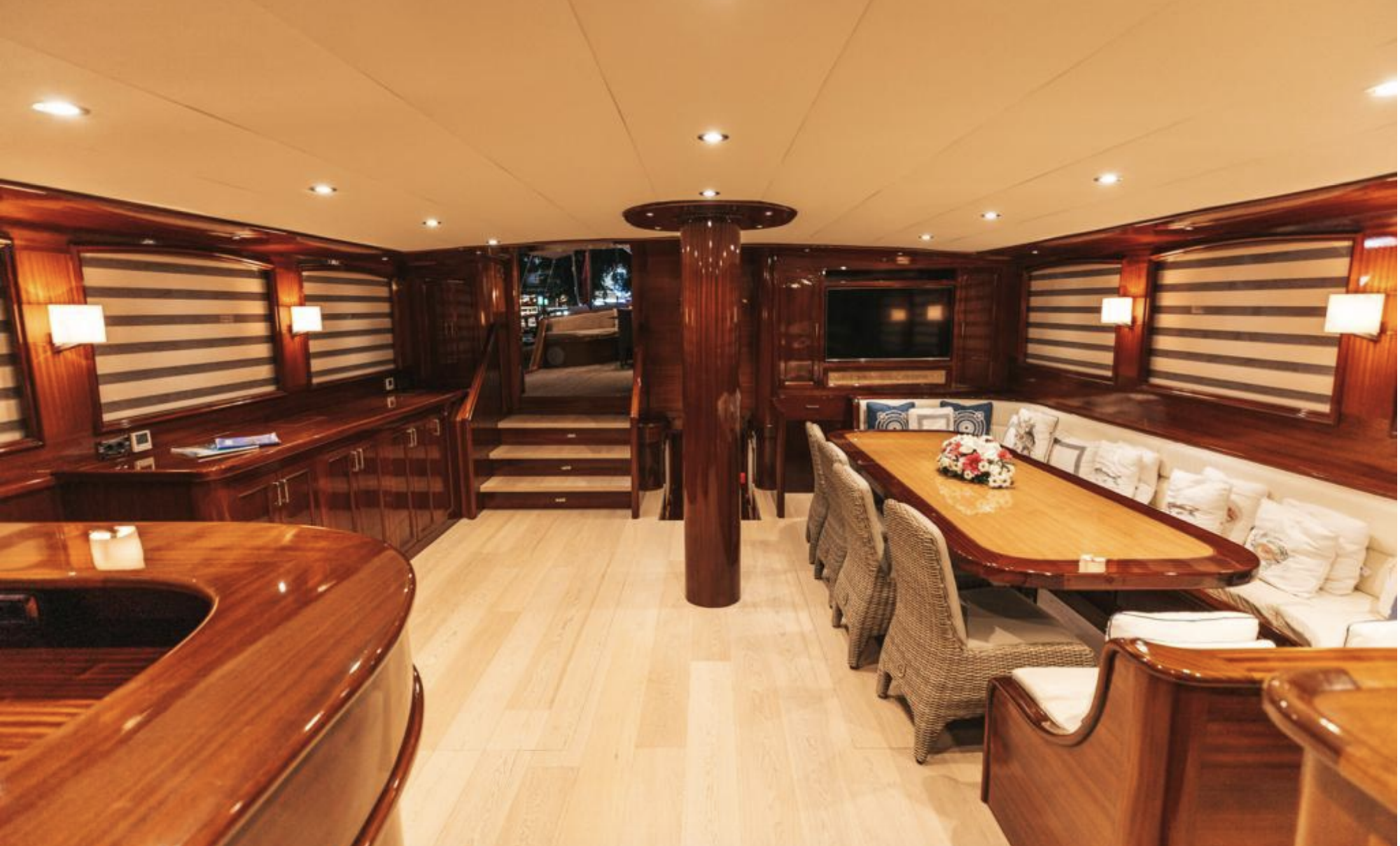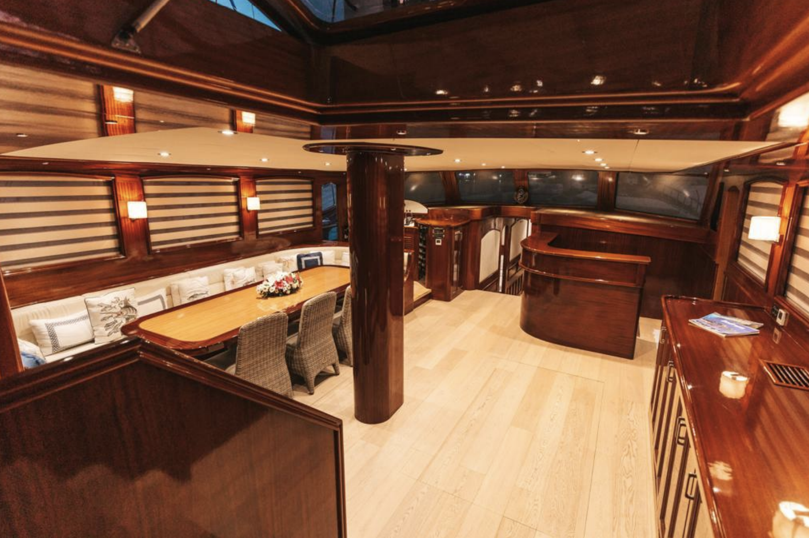 Her aft deck features a well designed dining area with a table capable of hosting 12 guests and a cushioned area for a relaxing lounging time.
