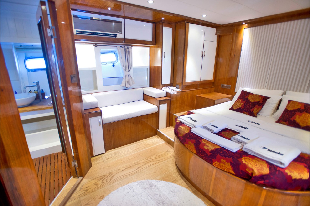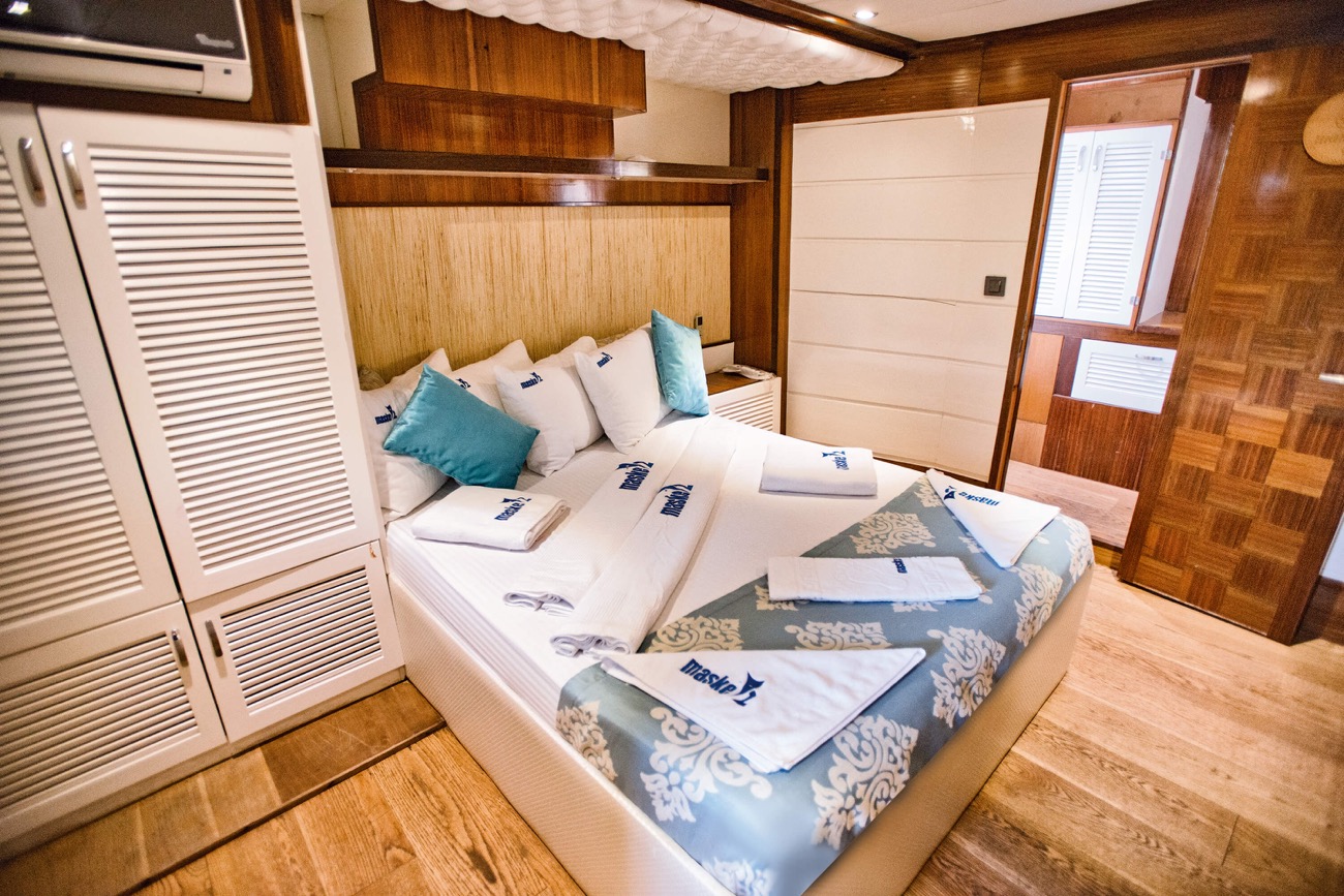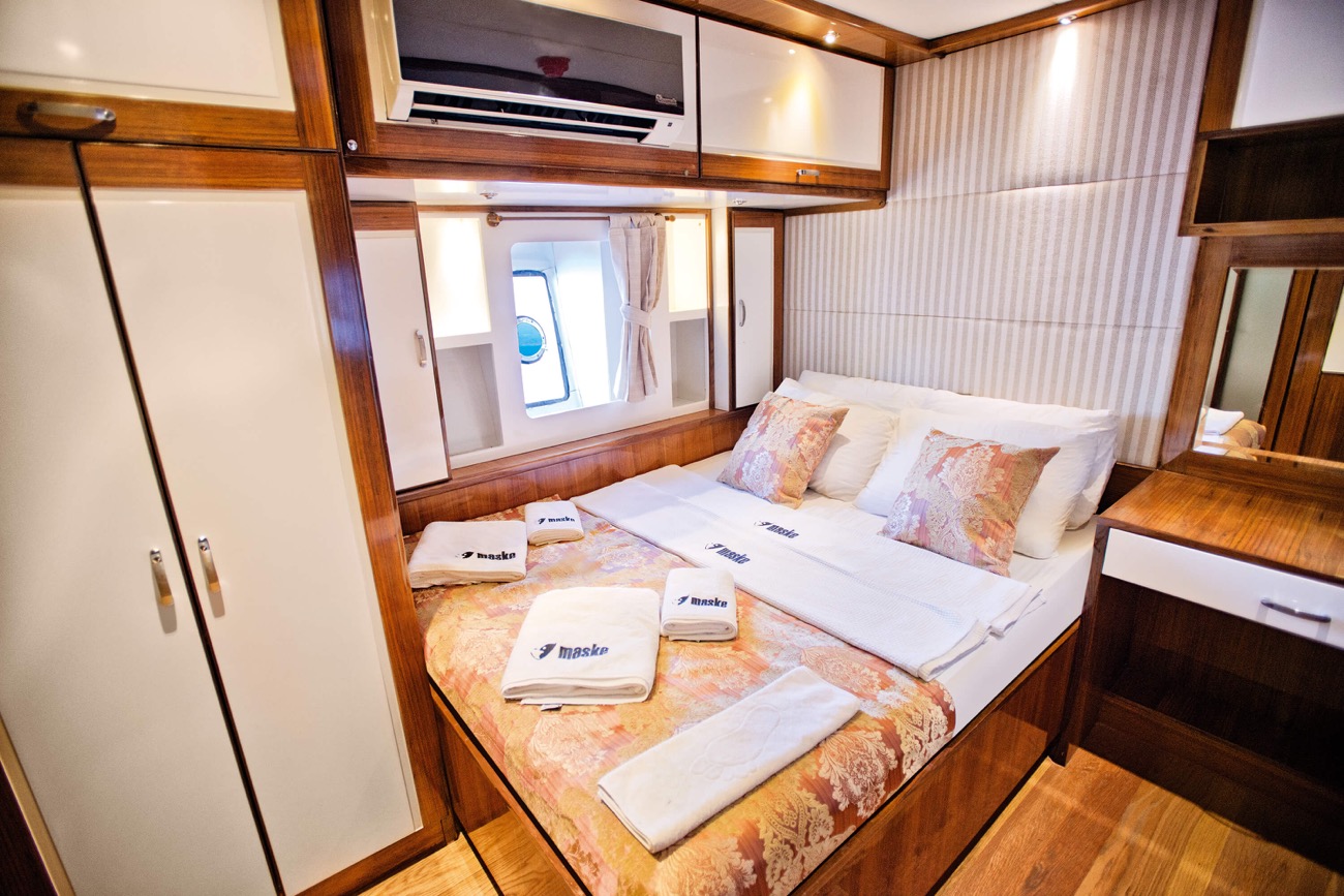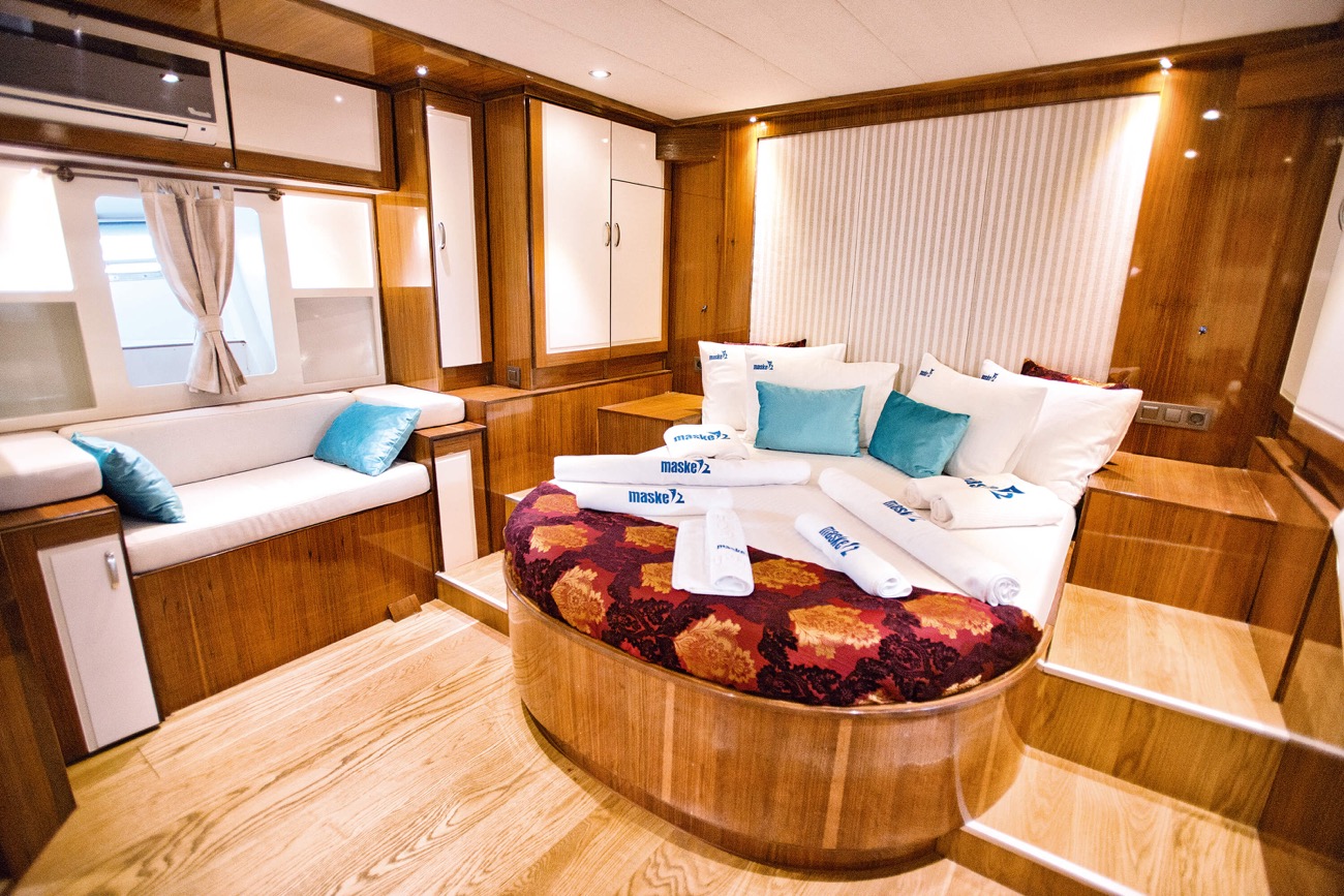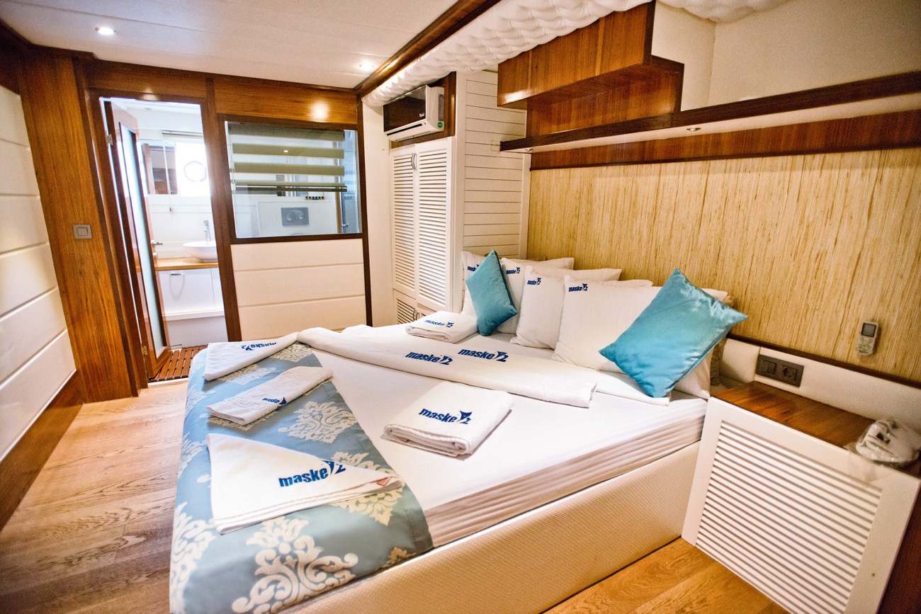MASKE 2 gulet has 6 cabins including 2 Master, 3 Double, and 1 Twin stateroom. 12 passengers will be comfortable to cruise in Marmaris, Fethiye, Bodrum, Gocek. You can rent this Turkish yacht and be sure that every wish of yours will be fulfilled with care and dedication from professional crew.