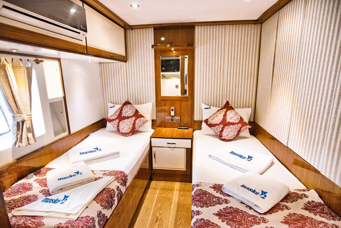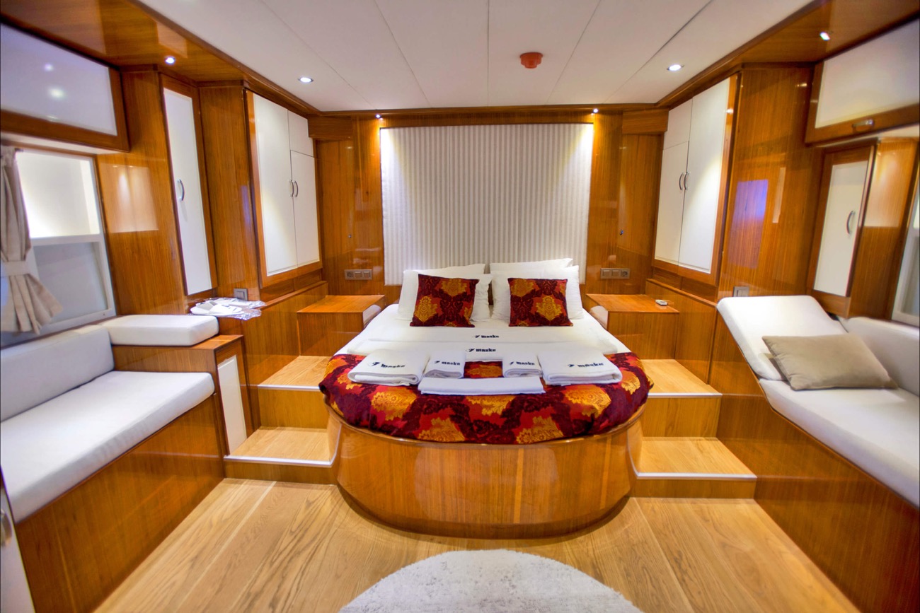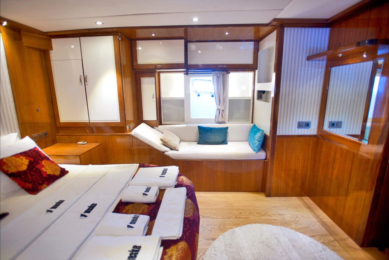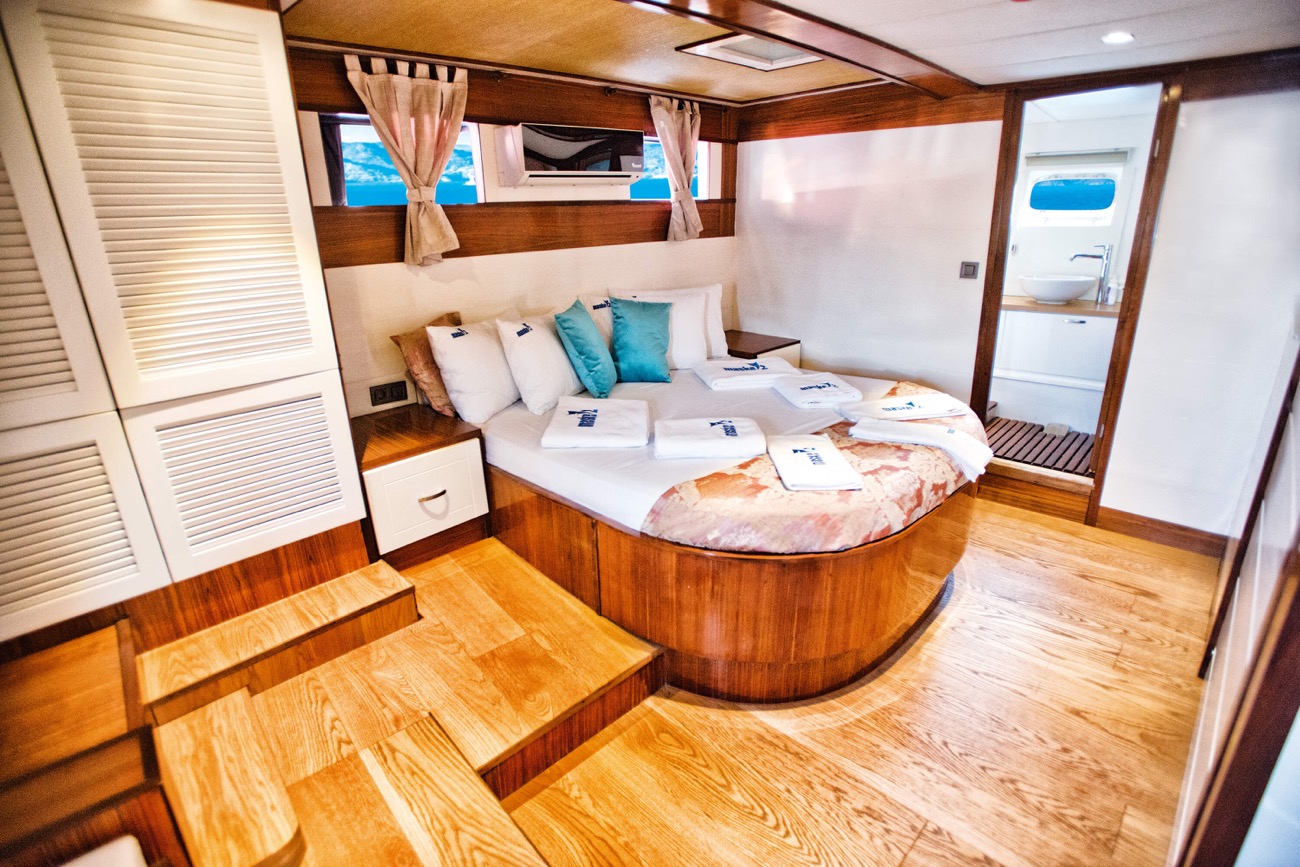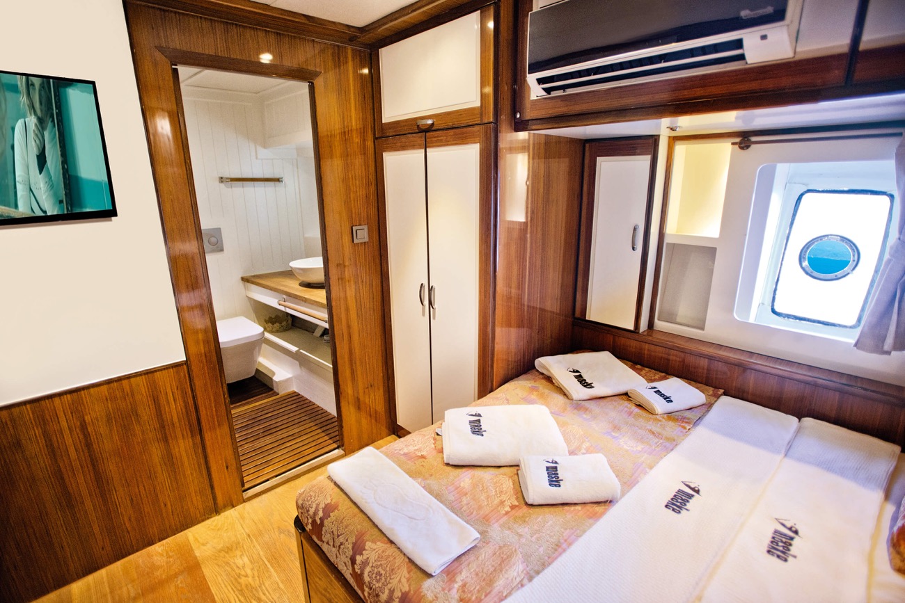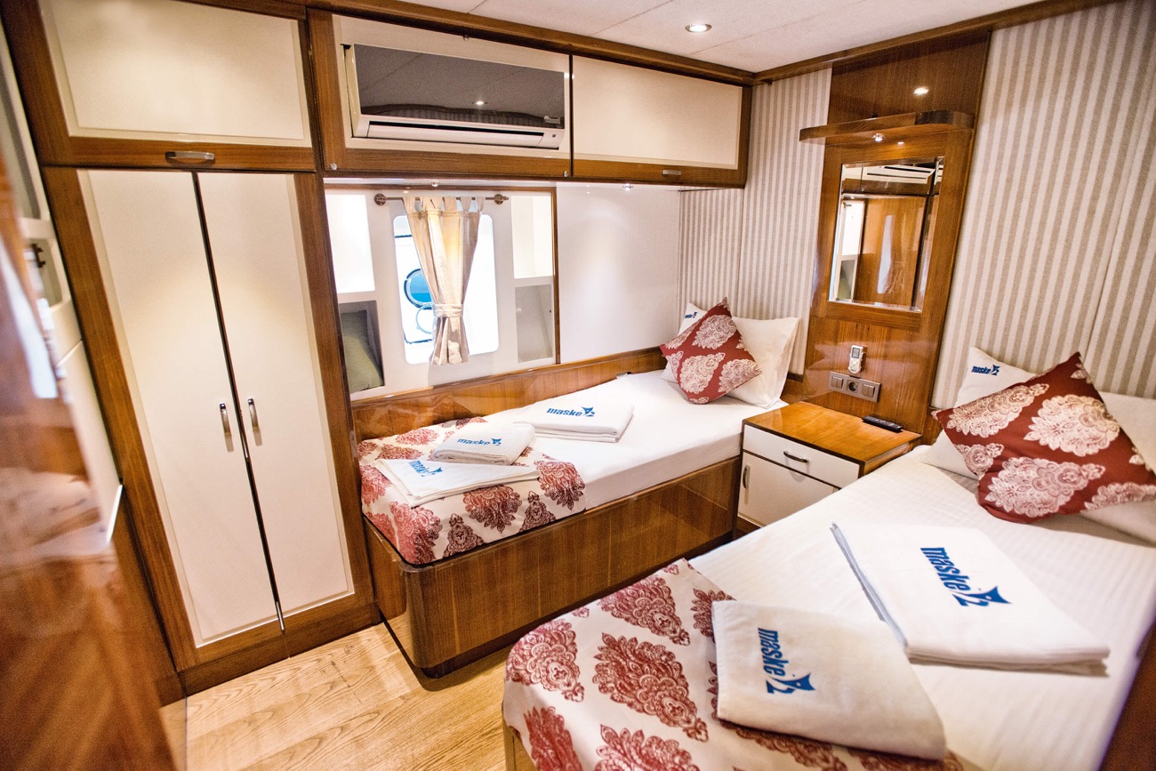 MASKE 2 gulet has 6 cabins including 2 Master, 3 Double, and 1 Twin stateroom. 12 passengers will be comfortable to cruise in Marmaris, Fethiye, Bodrum, Gocek. You can rent this Turkish yacht and be sure that every wish of yours will be fulfilled with care and dedication from professional crew.