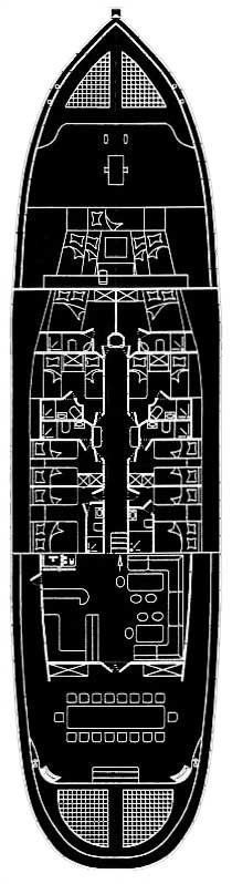 The cabin configurationhas allowed for two double cabins, two triple cabins and four twin cabins each with ensuites, air conditioning and a radio/CD player.