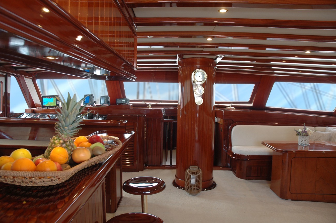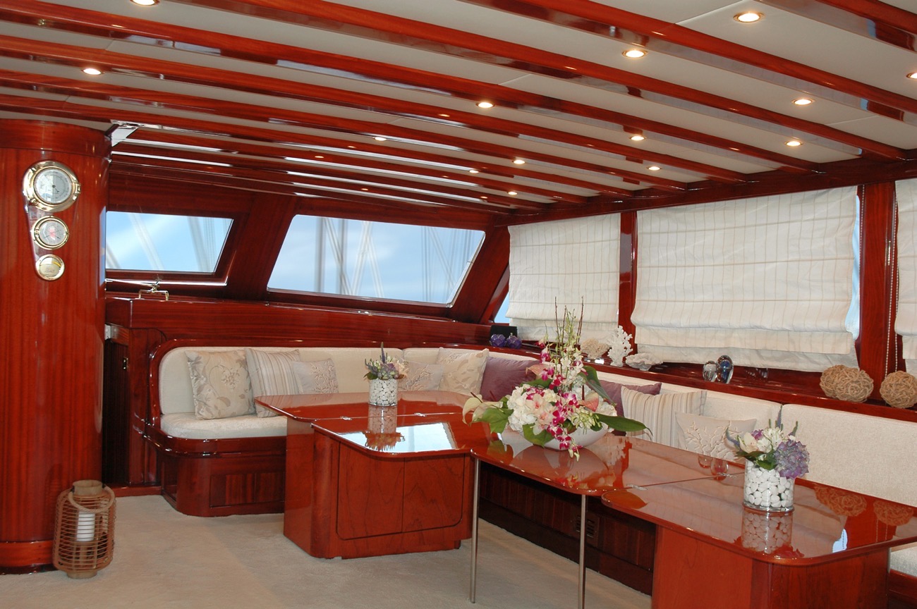 Your party continues after dark with a formal dinner in the MATINA's beautifully furnished salon. Mahogany features throughout this luxury motor sailor and the warmth of sand-coloured furnishings promotes a relaxed vibe as you turn up the music within the yacht's entertainment centre. You will enjoy the flavours of a masterfully prepared meal and the service of your dedicated crew. After dessert has been savoured - and perhaps seconds have been served! - it's time for coffee or digestifs, so make your way forward to the cushioned lounging area at the bow of the yacht for dancing and more music in a very private setting.