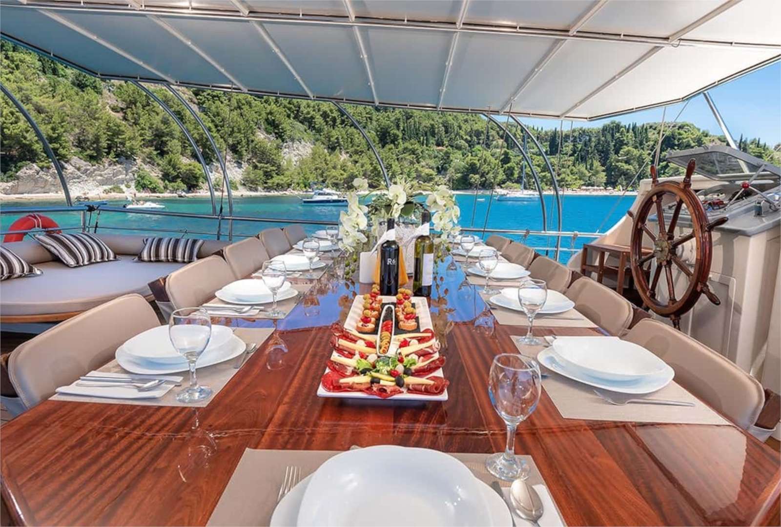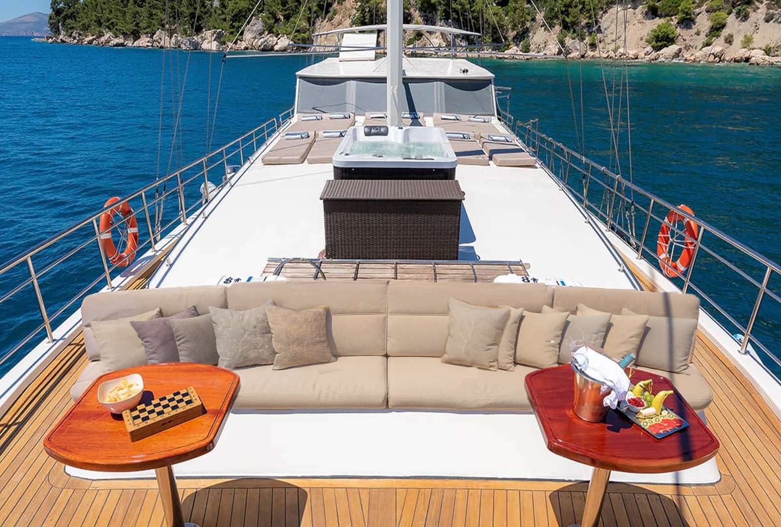 At the aft deck there’s a dining table where most meals are served, and a big cushioned area where it is nice to stay after a long breakfast or lunch and just read a book, talk with friends, listen to the music or watch the scenery as the yachts sails near Dubrovnik, Adriatic islands, Trogir, Split - you choose.